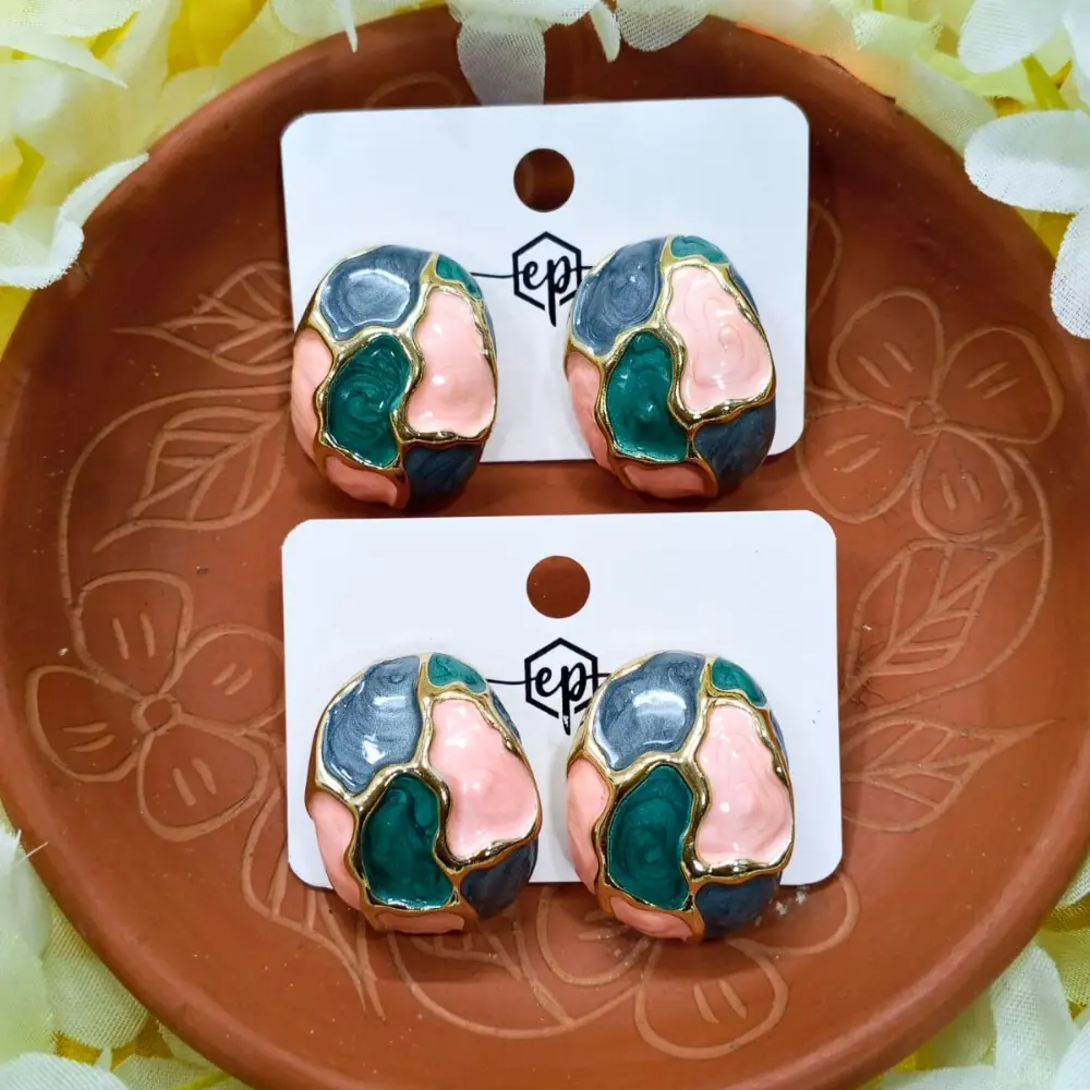 এই আধুনিক ডিজাইনের কানের দুলটি বিভিন্ন রঙের (গোলাপী, সবুজ, এবং ধূসর) স্টোন দিয়ে তৈরি। এটি আপনার প্রতিদিনের স্টাইল বা যেকোনো বিশেষ অনুষ্ঠানে পরিধান করার জন্য উপযুক্ত। সোনালী বর্ডার দিয়ে ঘেরা এই কানের দুলটি আপনার সাজকে একটি নতুন মাত্রা যোগ করবে।