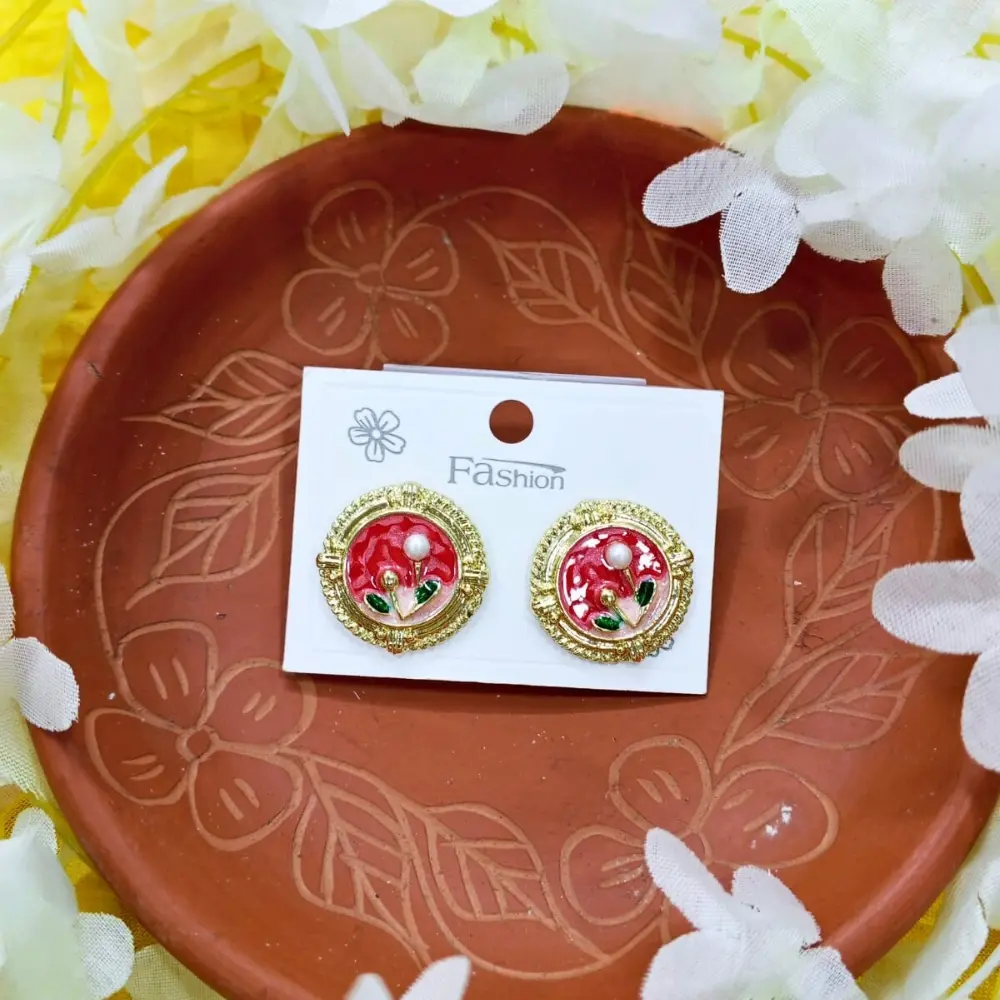এই সুন্দর কানের দুলটি সোনালী বর্ডারের সাথে লাল রঙের পেইন্ট এবং সবুজ পাতার ডিজাইন নিয়ে তৈরি। এতে একটি মুক্তো স্টোন রয়েছে যা গহনার সৌন্দর্য আরও বাড়িয়েছে। এটি আপনার যেকোনো আউটফিটের সাথে পরিধান করা যাবে এবং একটি আকর্ষণীয় লুক প্রদান করবে।